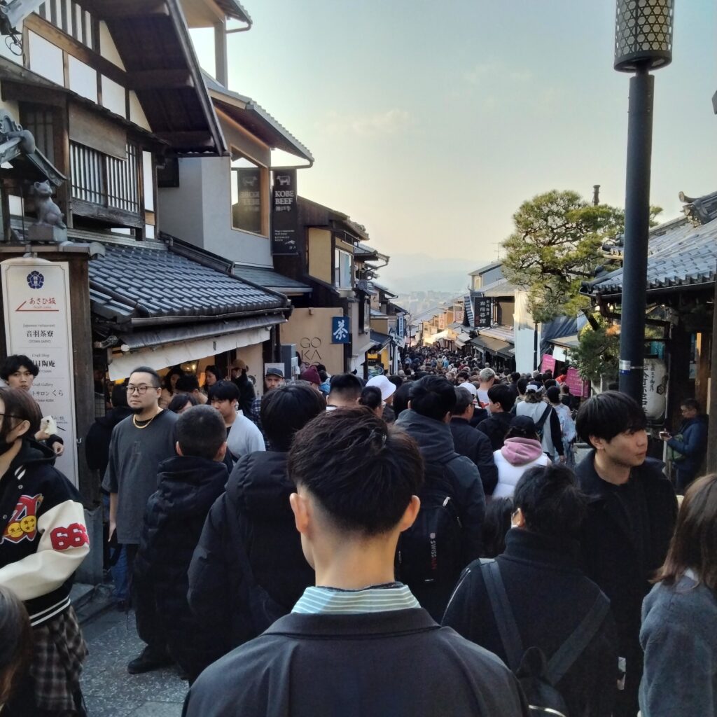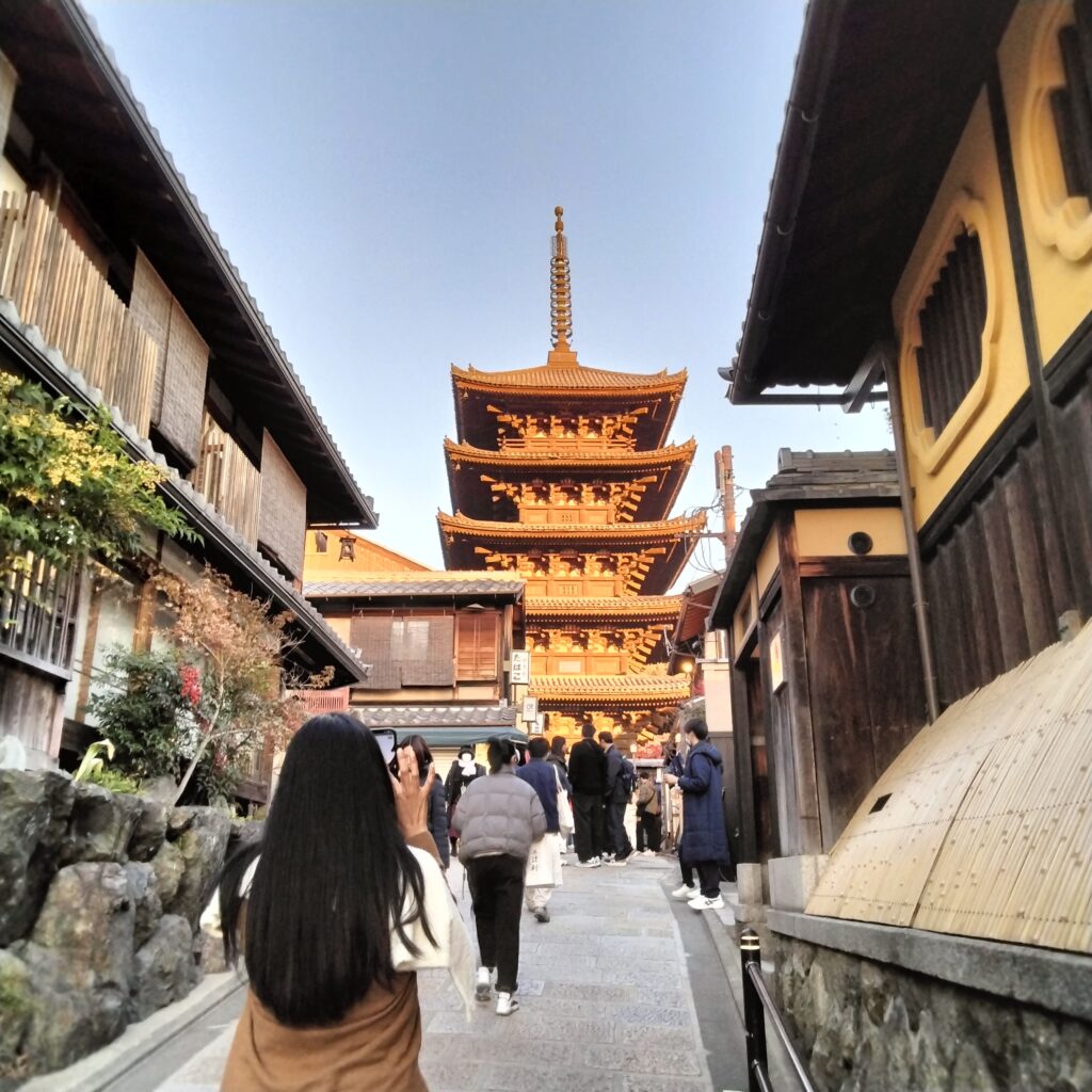 Yasaka-shrine:since 7th century , Gion:see Maiko, kennin-gi:zen-dera, Yasaka-Pagoda:five storied, Sannen-zaka:cobble stone, Kodai-zi:samurai general Hideyosi and his wife Nene.